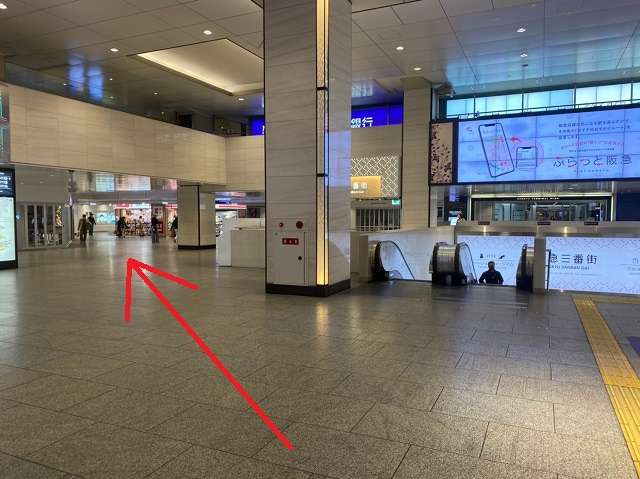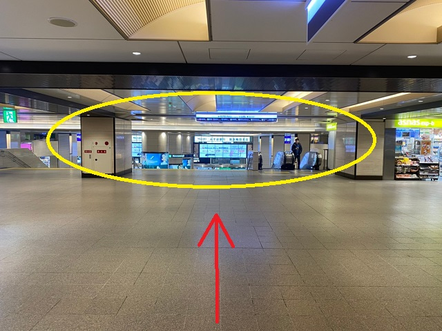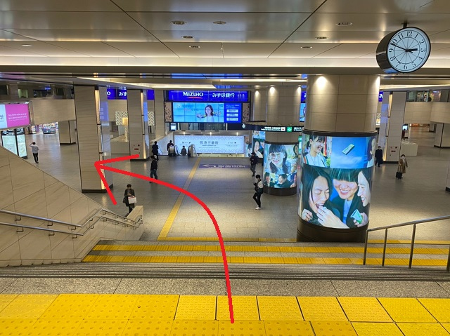 ①2階中央改札を出て、左側にある中央階段を目指します。
