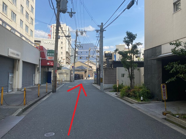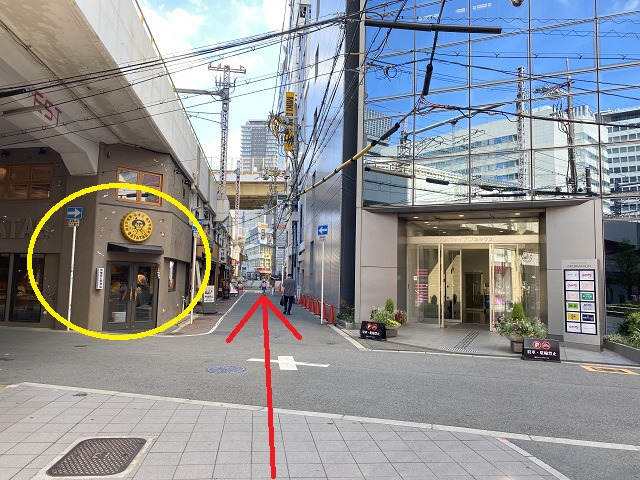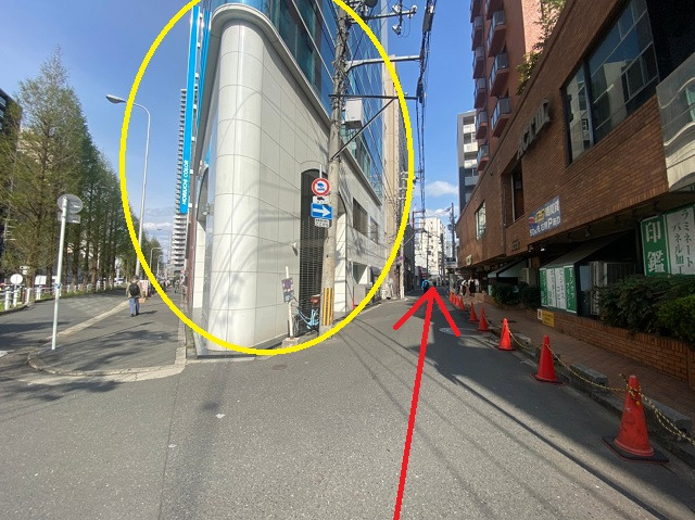 ⑰ガラス張りのビルを左手にし、脇道を直進します。