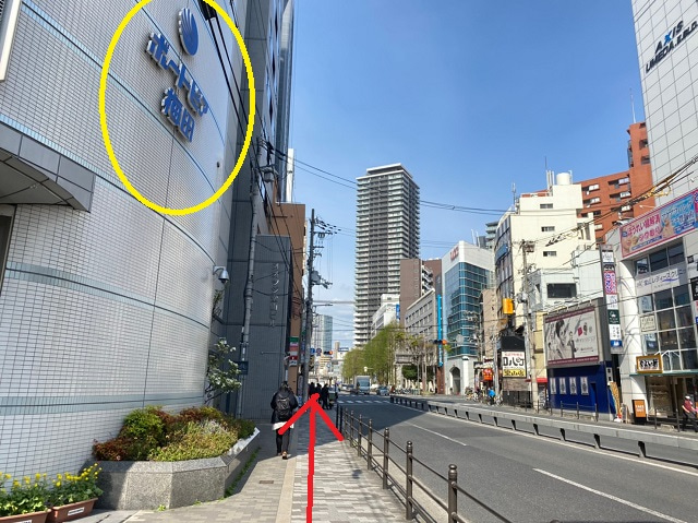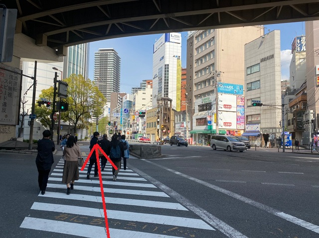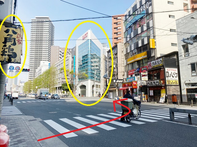 ⑯六角鶏の看板がある交差点まで進み、ガラス張りのビルの方向へ信号を渡り進みます。