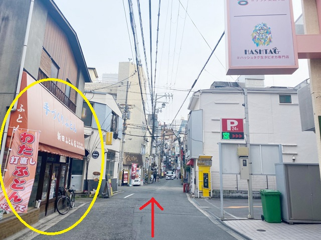 ⑳ふとん屋を左手に十字路までまっすぐ進みます。